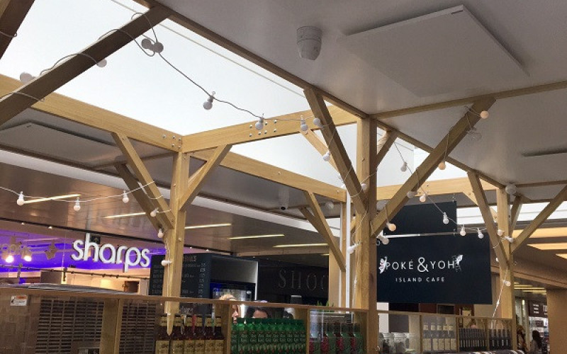 The owners of Poke & Yoh wanted to open an Island Café in the Regent Arcade Shopping Mall in Cheltenham, UK. The Hawaiian themed food bar was designed to create a sunny Polynesian atmosphere.
